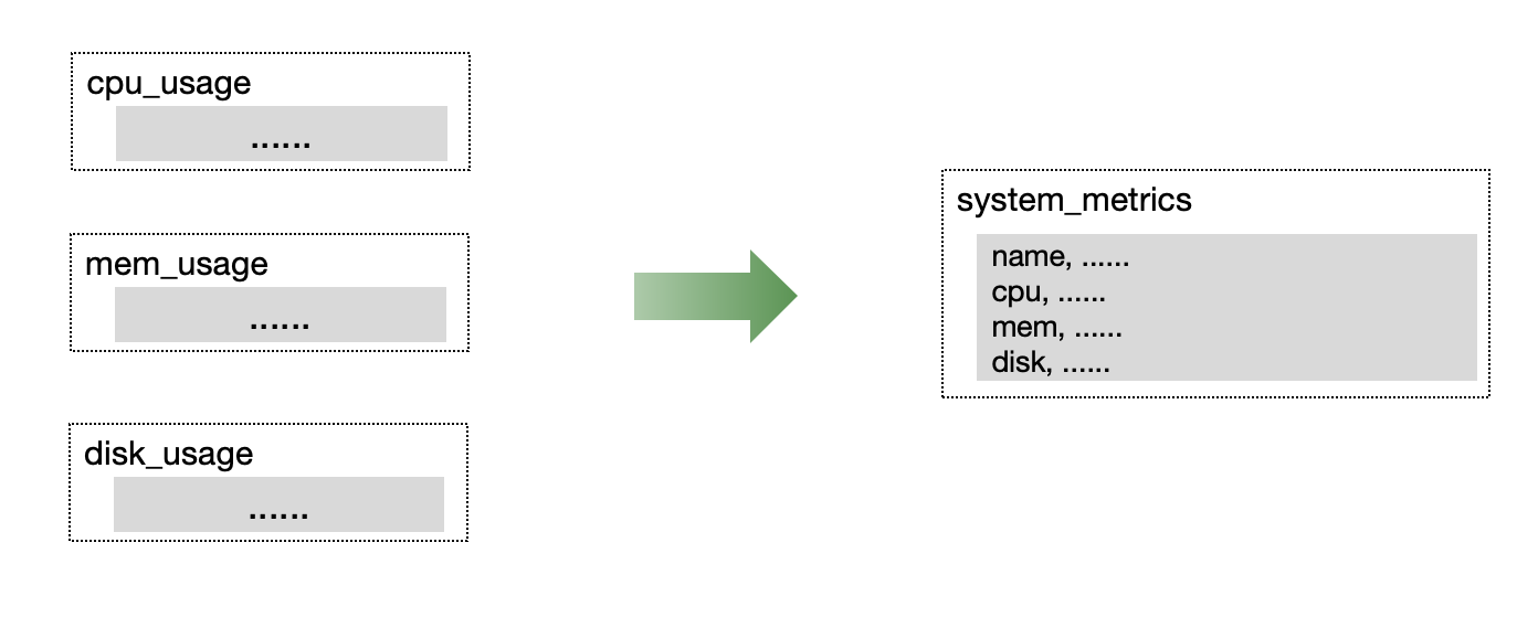 在监控或 IoT 场景中,通常同时收集多个指标。 我们建议将同时收集的指标放在单个表中,以提高读写吞吐量和数据压缩效率。