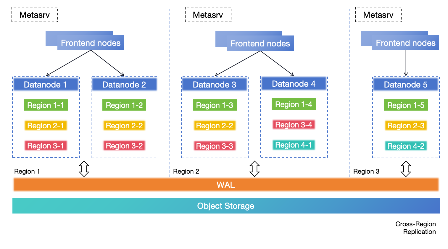对于需要零 RPO 的中大型场景,强烈推荐此解决方案。 在此部署架构中,整个集群跨越三个 Region,每个 Region 都能处理读写请求。 两者都必须启用跨 Region DR 并使用远程 WAL 和对象存储实现数据复制。 如果 Region 1 因灾难而完全不可用,其中的表 Region 将在其他 Region 中打开和恢复。 Region 3 作为副本遵循 Metasrv 的多种协议。